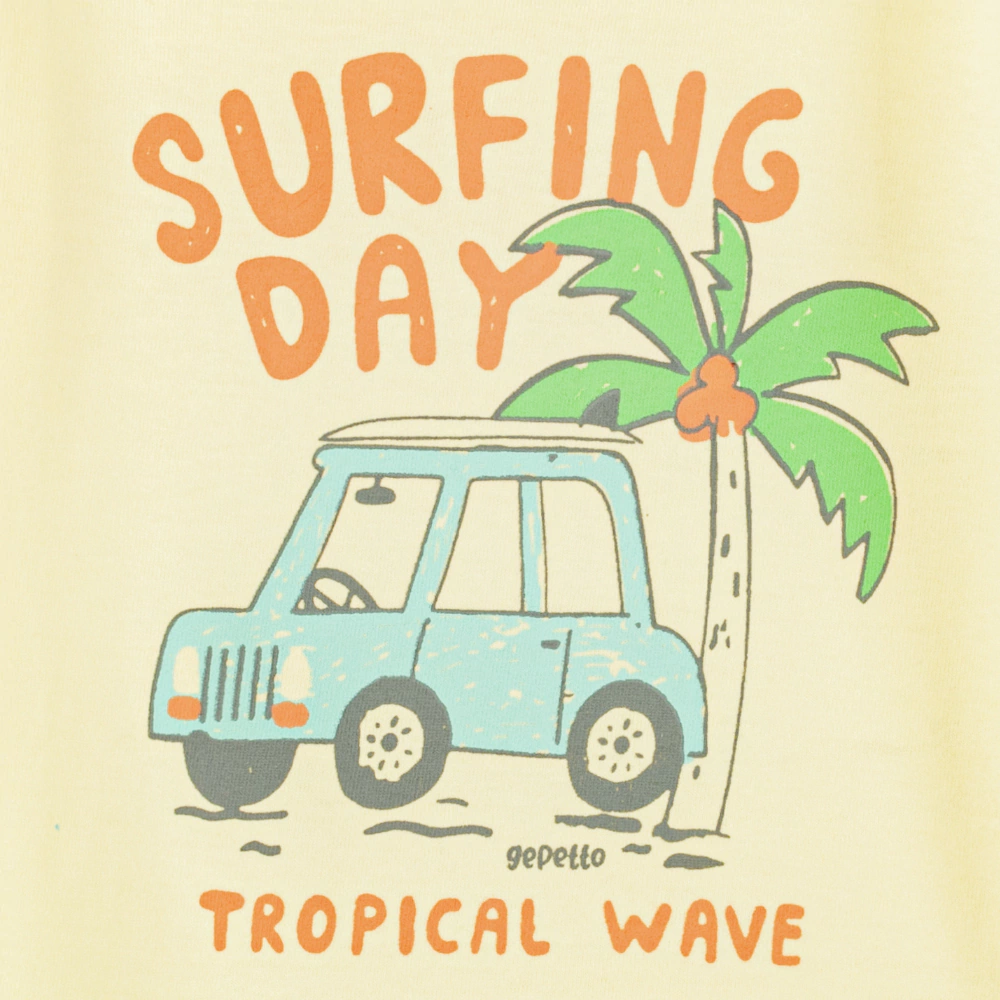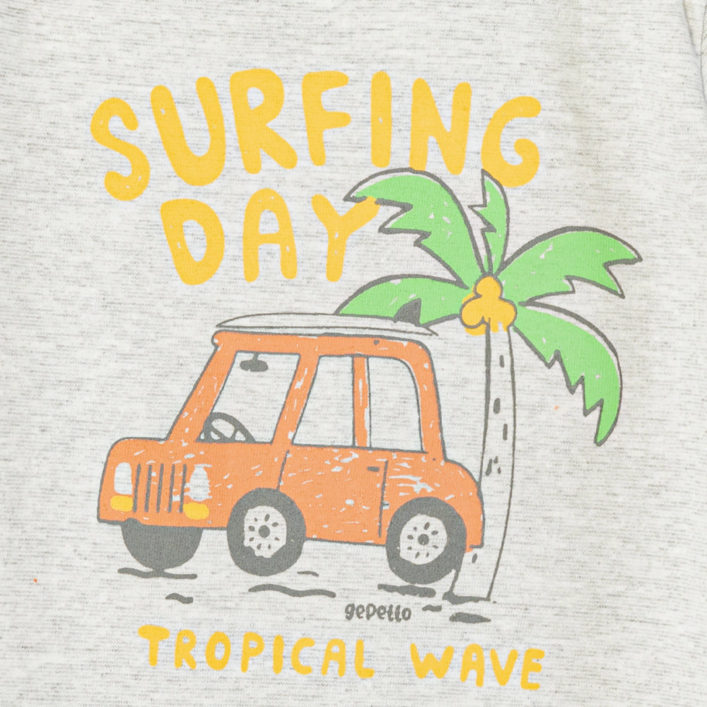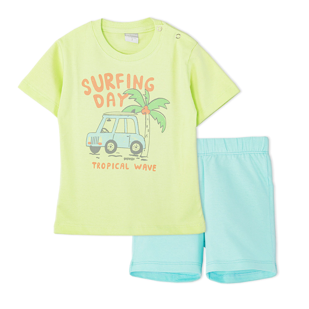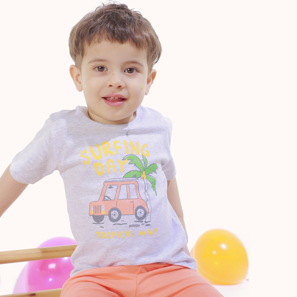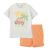Conjunto bebé varón combinado remera jersey 100% algodón y 88% algodón 12% poliéster el color melange y bermuda. La remera lleva una estampa central. Su apertura es por el hombro en forma de cartera con broche arito metálico. La bermuda es de jersey, lleva elástico en toda la cintura. Este conjunto va del 1 al 6.