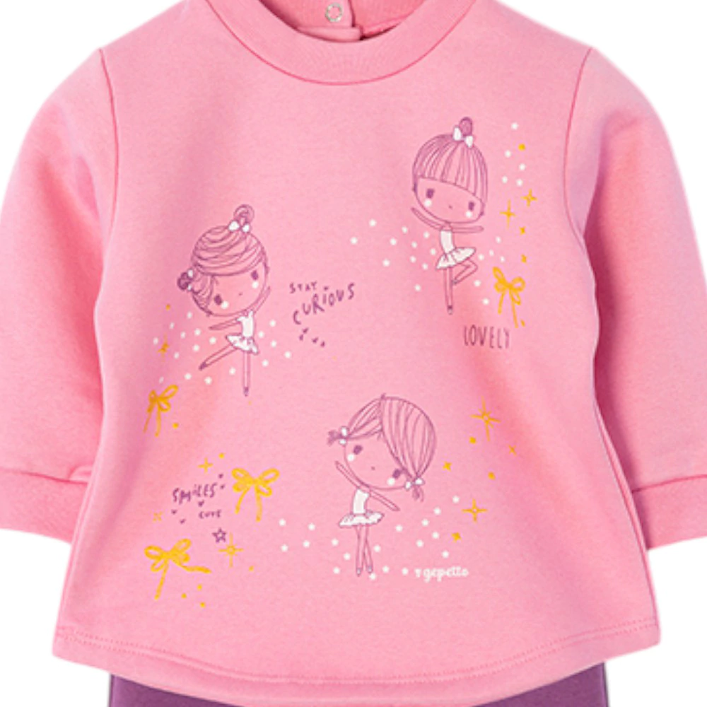 Con una hermosa estampa full de "bailarinas", este jogging no solo es práctico, sino también adorable. Los detalles como el cuello y puños de ribebé añaden un toque elegante y delicado, mientras que el broche en la parte posterior facilita el vestir a tu bebé, especialmente en los talles más pequeños hasta 3/18 meses.