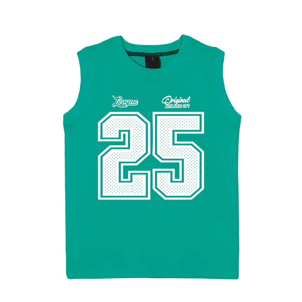 Musculosa jr varón 100% algodón con cuello y mangas de ribb para una mayor elasticidad. Lleva estampa en el frente de estilo college con un número delantero con detalles “perforados” que imitan una camiseta de básquet, es perfecta para un look urbano y relajado. Viene del talle 2 al 16 en tres variantes de color.