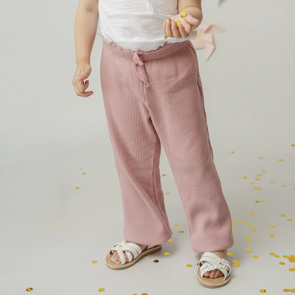Pantalón para bebé niña confeccionado en tejido de algodón tipo gasa arrugada, suave y respirable, en color beige neutro que combina con todo. Diseño de calce recto con pierna ancha estilo palazzo, ideal para brindar comodidad y libertad de movimiento.