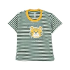 Remera bebé varón manga corta rayada 100% algodón con estampa central. Tiene cuello de ribebé combinado. Su apertura es en lateral en forma de cartera con broche metálico. Esta remera va del 1 al 6.