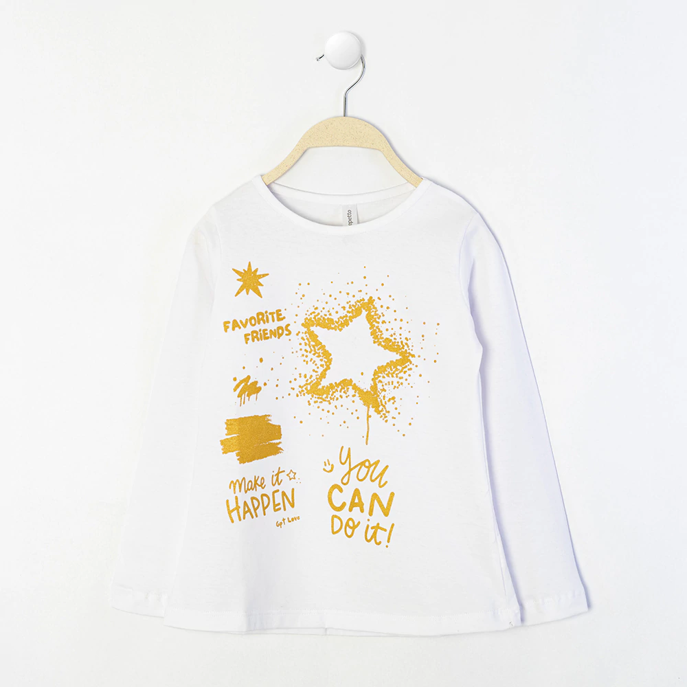 ¡Incorporá a su ropero la Remera jr nena con estampa full dorado "estrellas", una prenda que combina delicadeza, estilo y comodidad para acompañar a tu niña en cada momento del día!