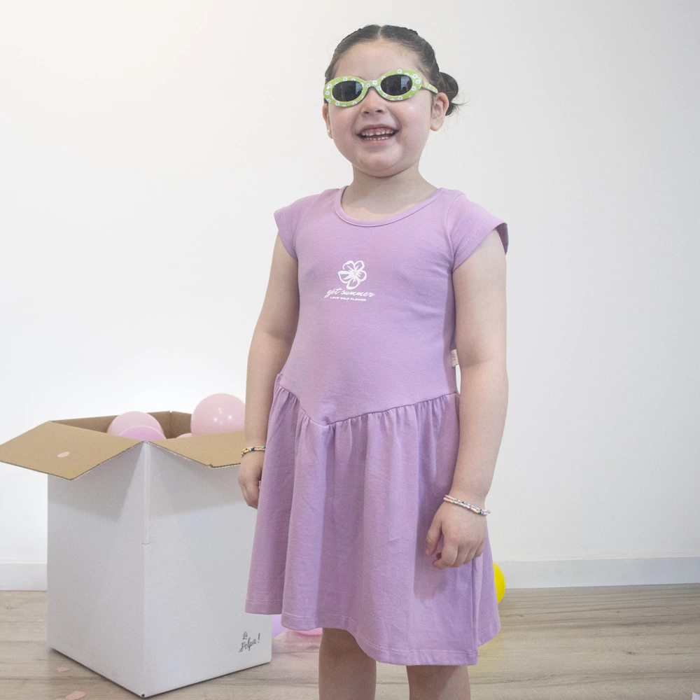 Vestido jr nena 100% algodón peinado suave al tacto. Diseño de corte evasé con recorte delantero en V y frunce en la falda que aporta vuelo y caída, lleva el escote redondo y las costuras son reforzadas lo que permite mayor durabilidad. Estampa frontal de flor que le suma un detalle fresco y veraniego. Viene del talle 2 al 16 en tres variantes de color.