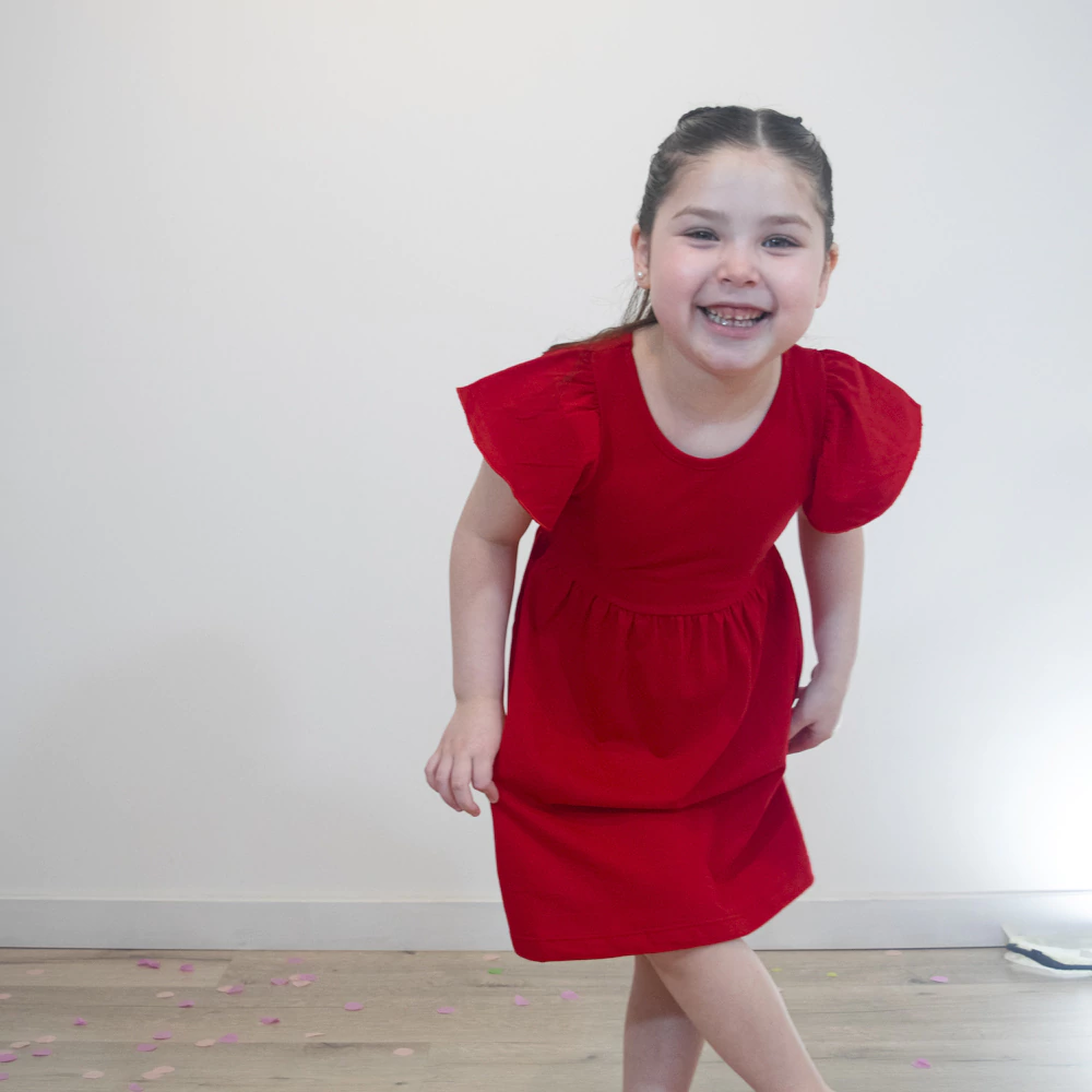 Vestido jr nena 100% algodón peinado suave al tacto. Diseño de corte evasé con falda amplia y frunce que aporta vuelo y caída natural. Escote redondo y manga corta con un pequeño frunce en la copa generando un detalle femenino y delicado. Viene del talle 2 al 16 en tres variantes de color.